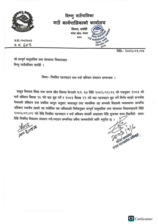 नियमित पठनपाठन तथा भर्ना अभियान सञ्चालन सम्बन्धमा सूचना।